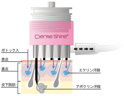 ダーマドライは、“ダーマシャイン®”という最新機械を用いて、スピーディーに確実に均一にボツリヌストキシン製剤を注入することで、傷跡を作らずに痛みも少なく確実に、中度~重度の多汗症・わきがを解決できる治療です。